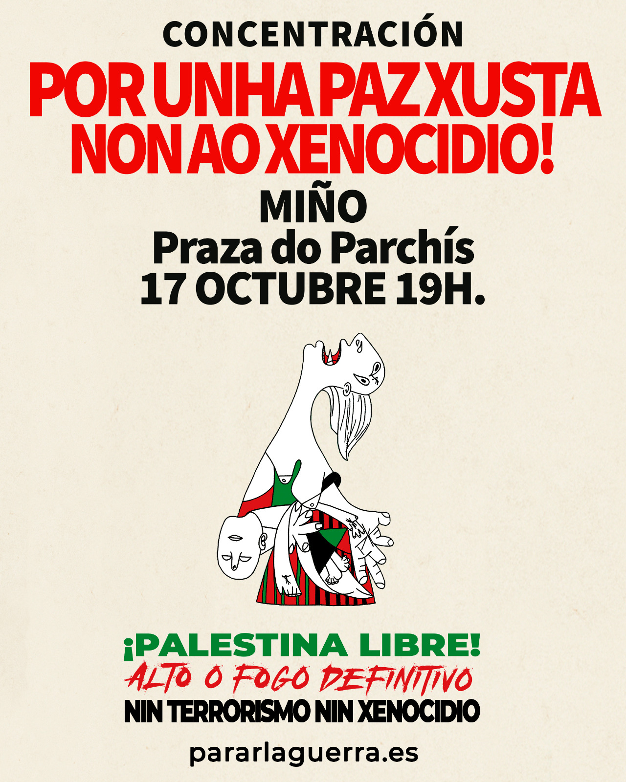 O concello convida o pobo de Miño a acudir á concentración convocada por pararlaguerra.es POR UNHA PAZ XUSTA, NON AO XENOCIDIO que terá lugar este venres 17 á 19 h na Praza do Parchís